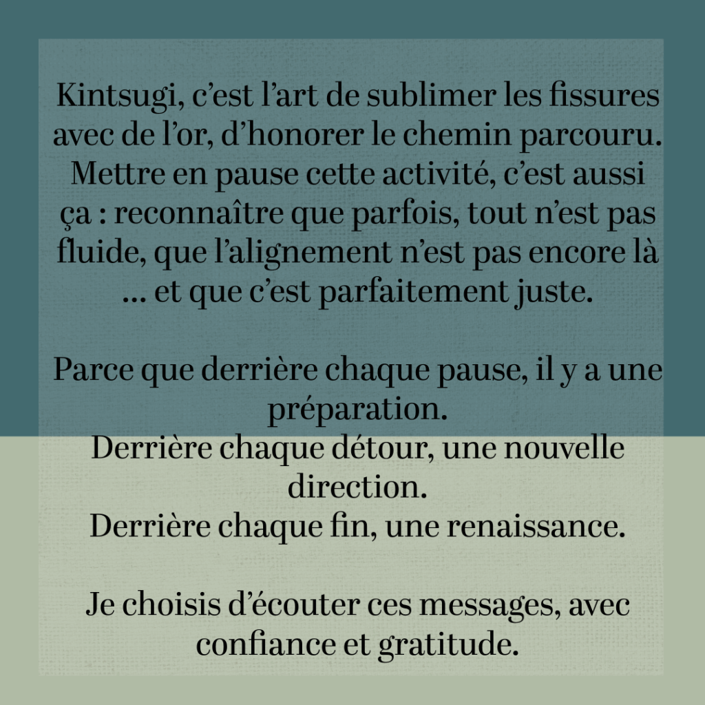 J’ai choisi le nom Kintsugi pour mon entreprise car il symbolise tout ce en quoi je crois. Nous traversons tous des épreuves, des moments où nous nous sentons fissurés, voire brisés. Mais ces failles, si nous les acceptons et les réparons avec douceur et bienveillance, peuvent devenir des sources de lumière, d’inspiration et de transformation.